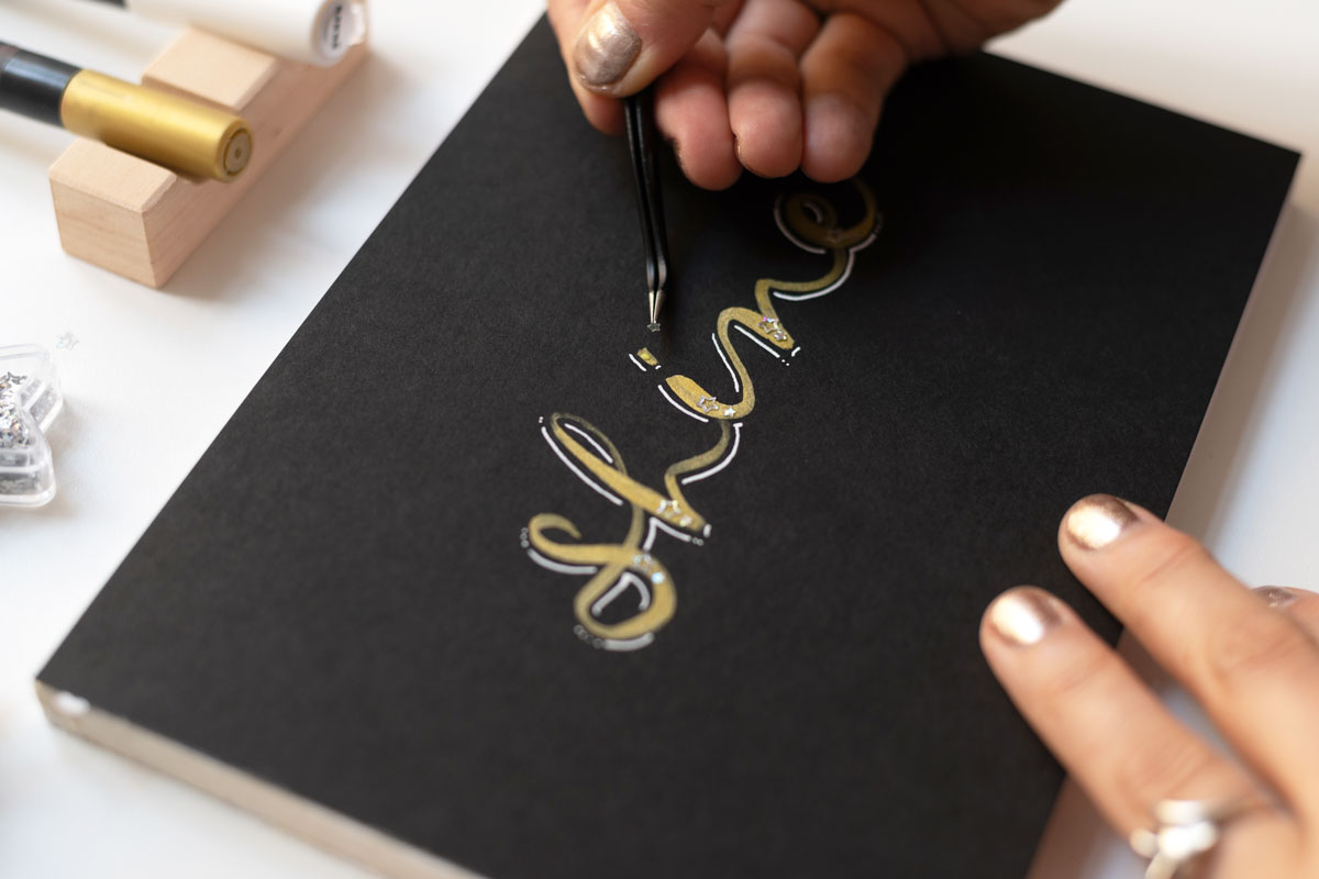 Überlege dir zunächst, welches Wort du auf welche Art und Weise schreiben möchtest. Wir haben uns für das Wort „shine“ in einem handschriftlichen Stil entschieden. Teste deinen Schriftzug eventuell auf einem Schmierpapier, bevor du auf deinem Kartenpapier loslegst. Sobald du dich sicher fühlst, kannst du mit dem goldenen Brush Pen deinen Schriftzug umsetzen – gerne in deiner ganz eigenen Handschrift.